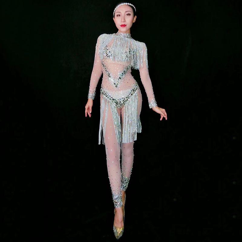 Beyonce Silver Crystal Rhinestone Bodysuit Leotard Sexy Costume Stage Dance Costume Nude Spandex Gogo Drag