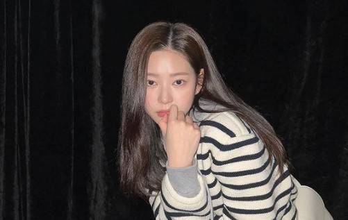 In the photo, Kim Min-joo took a picture wearing a striped cardigan and a blue skirt. His charismatic chic eyes and small face were impressed.