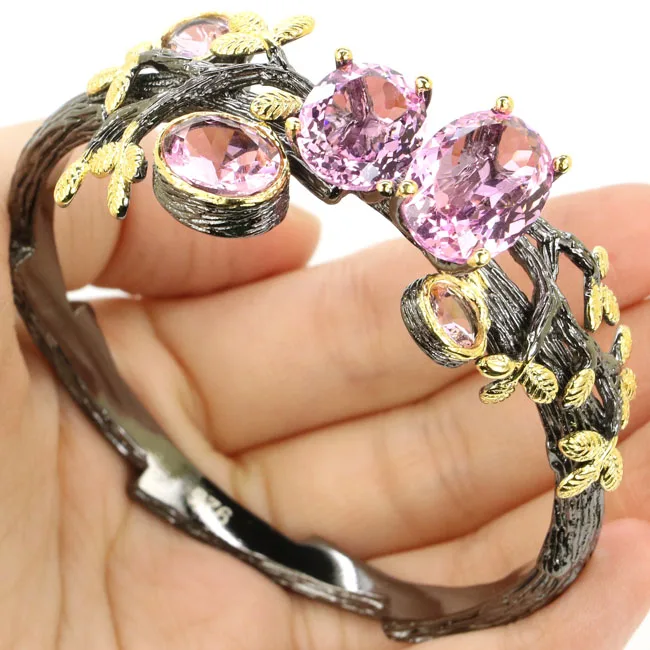 Vintage Rough Pink Tourmaline Ladies Engagement 925 Black Silver Cuff Bangle Bracelet 7-8inch 55x26mm